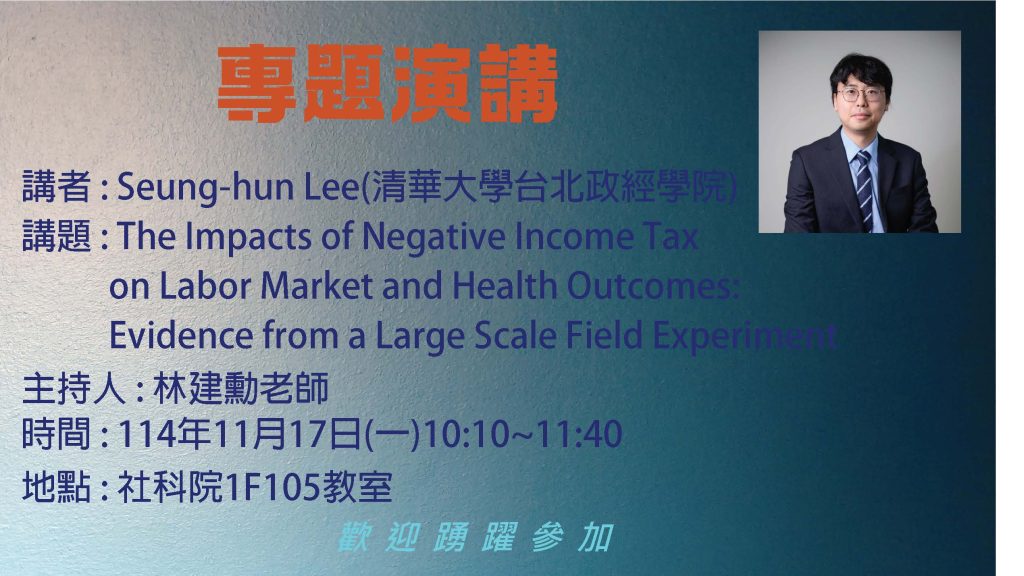 114年11月17日專題演講:The Impacts of Negative Income Tax on Labor Market and Health Outcomes: Evidence from a Large Scale Field Experiment / Seung-hun Lee(清華大學台北政經學院)